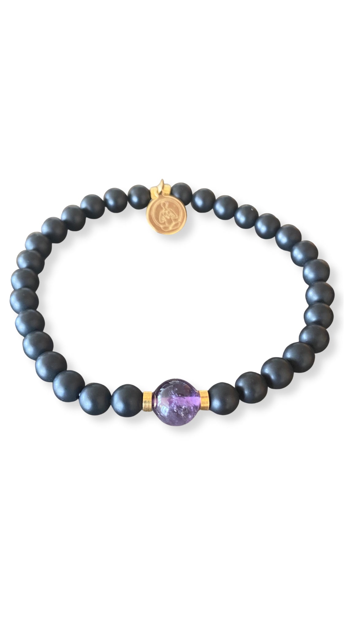 Black onyx gemstones highlight a single Amethyst gemstone with our signature gold-plated logo charm.
