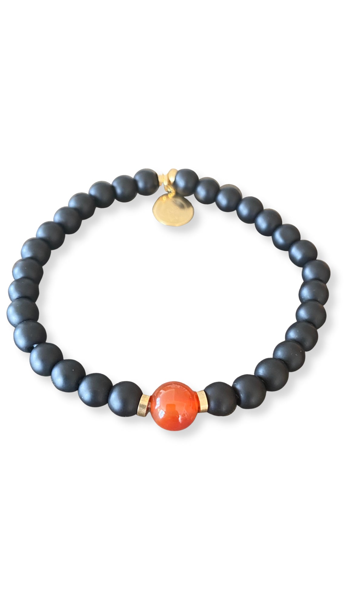 Black onyx gemstones highlight a single Carnelian gemstone with our signature gold-plated logo charm.