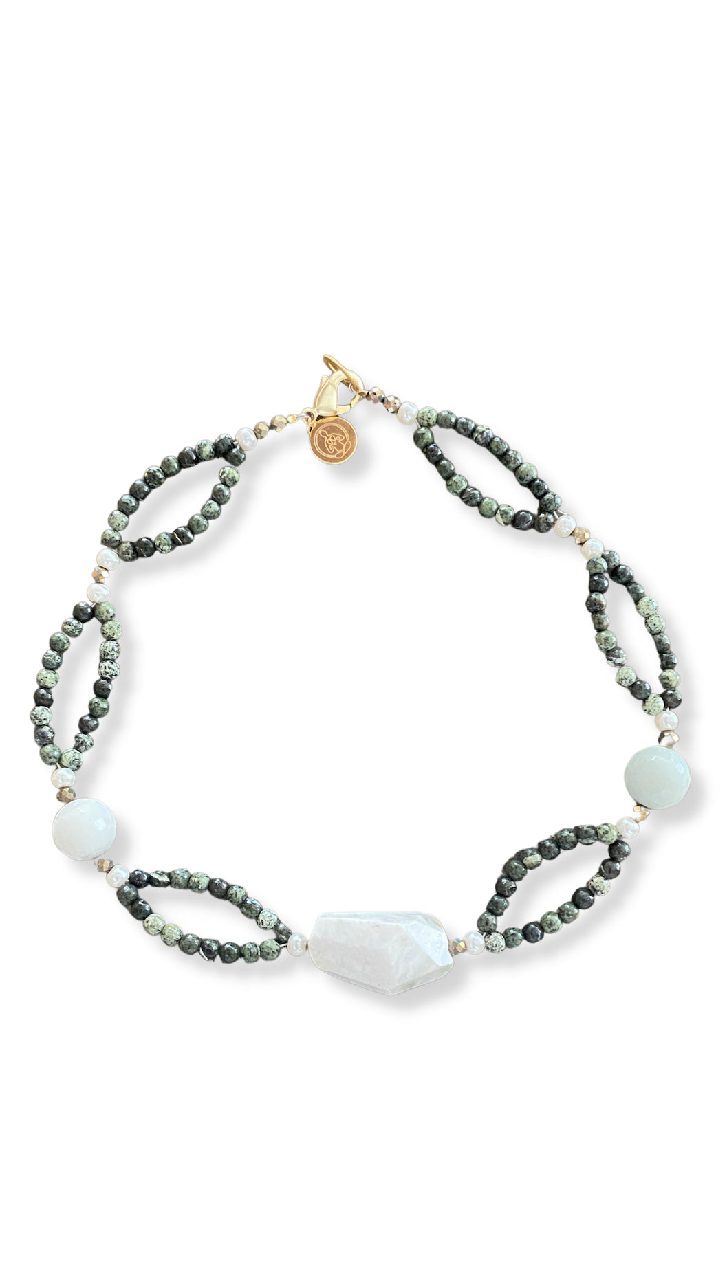15" 108 Kambaba gemstones, fresh water pearls, amazonite accents, and moonstone center piece.