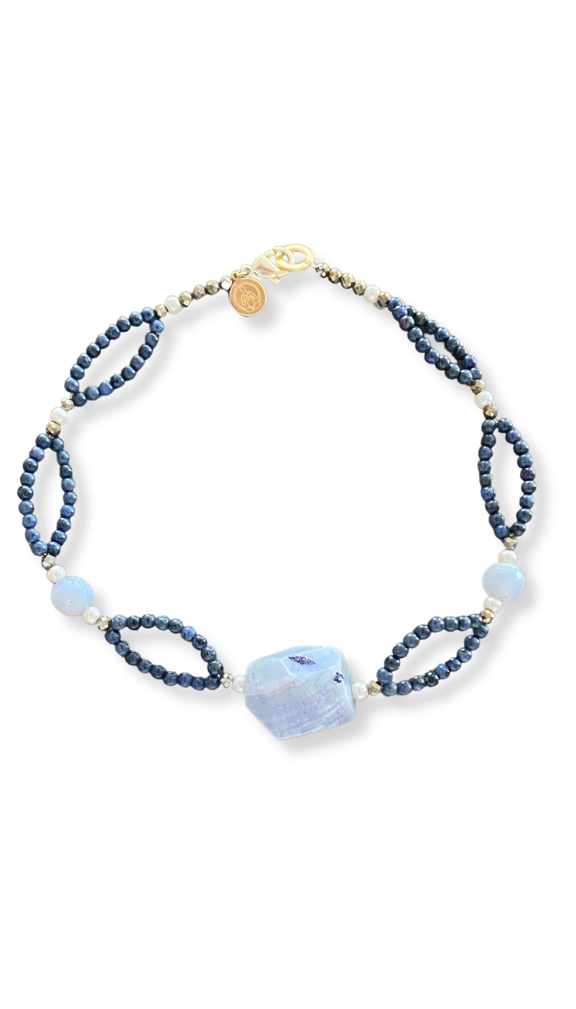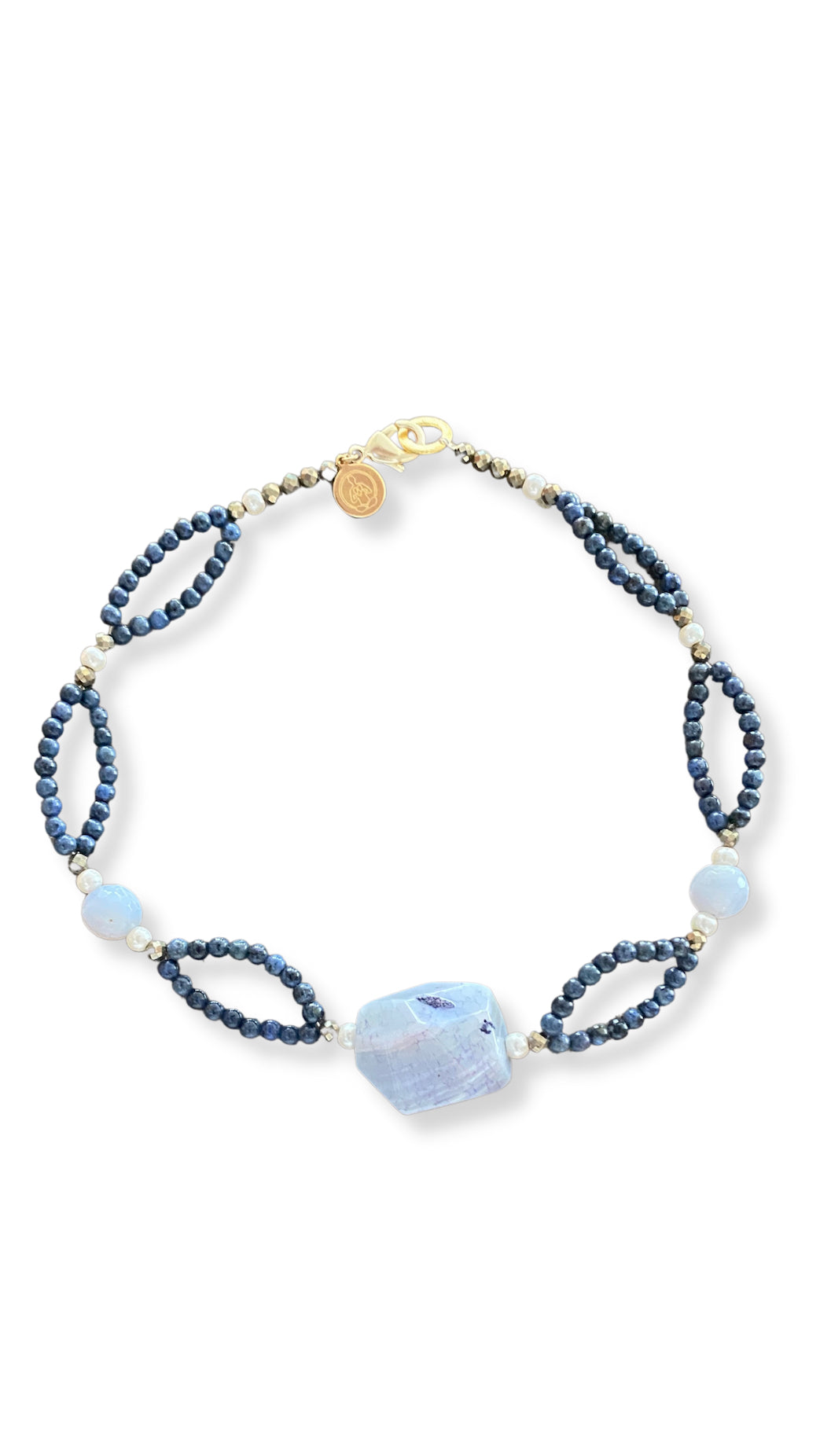 15" 108 Lapis Lazuli gemstones, fresh water pearls, and Aquamarine accents with Blue Agate center piece.